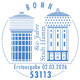 800 Jahre Stadt Hamm – mit großartigen Projekten im Rahmen von Feierlichkeiten können wir zwar noch aufwarten, aber es gibt Neuigkeiten zur Sondermarke, die am 02. März 2026 herausgegeben wird. Nach Rücksprache mit der Stadt Hamm dürfen wir sie zwar immer noch nicht auf unserer Seite zeigen, aber nach dem Hinweis, dass die Sondermarke seit einigen Tagen auf der Seite des Bundesfinanzministeriums zu sehen ist, wird gerade geklärt, ob wir sie dann doch schon auf unseren Seiten zeigen dürfen.